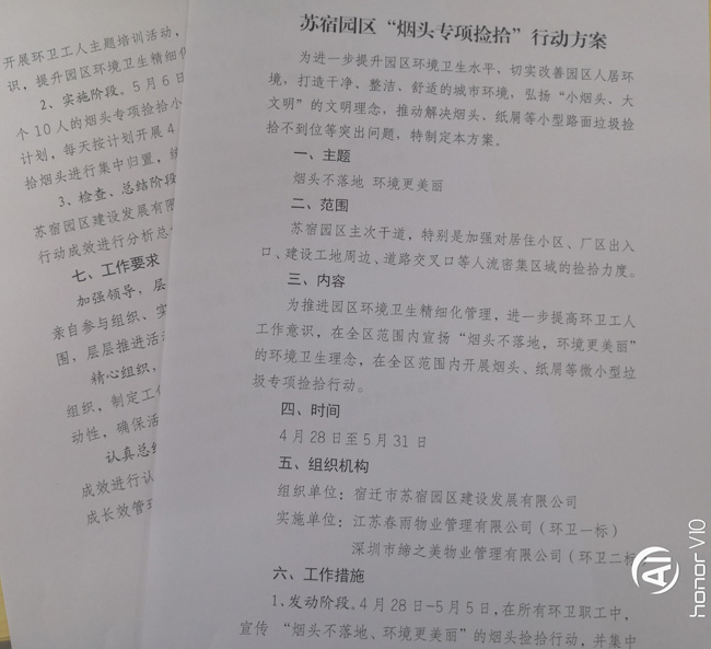 為了確?!盁燁^專項(xiàng)撿拾”行動(dòng)順利開展,公司結(jié)合園區(qū)實(shí)際,精心籌劃,制定了《蘇宿園區(qū)“煙頭專項(xiàng)撿拾”行動(dòng)方案》。