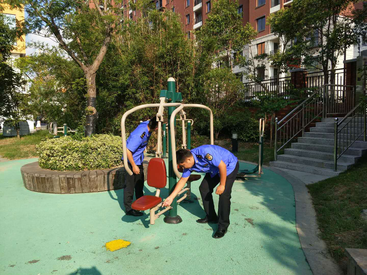 公司市政物業(yè)部為戶外健身器材“體檢”