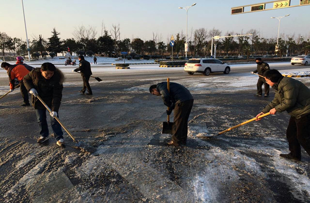 清晨6時,市政部工作人員和環(huán)衛(wèi)工人已經(jīng)開始對轄區(qū)部分主要路段進行除雪除冰作業(yè)。在凜冽寒風(fēng)中,他們不畏嚴寒,經(jīng)過近3小時的清掃除冰,截至上午9時,青海湖西路、通達大道、紫金山路等主干道及蘇州公園人行道已基本完成路面積雪清掃。